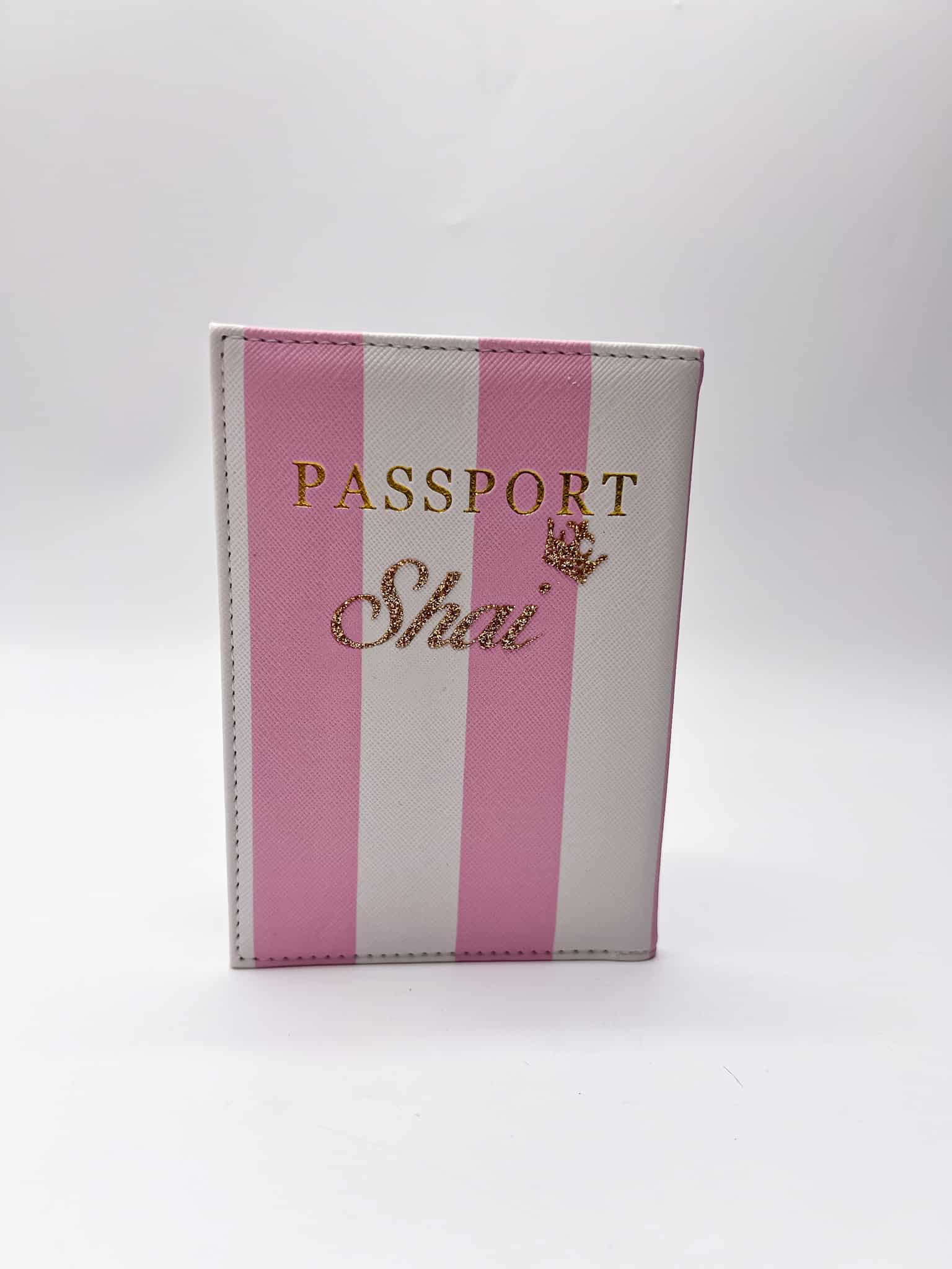 כיסוי דרכון ורוד לבן דגם ויקטוריה עם שם לבן ורוד פסים