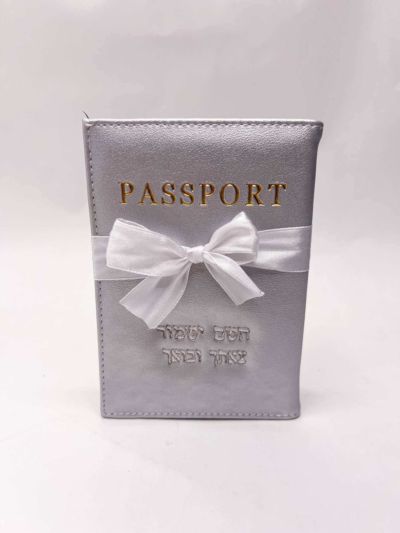 כיסוי דרכון בצבע כסף מגיע עם רקמה אישית לבחירה. מגיע ארוז עם צלופן וסרט. גודל הכיסוי 10X14 ס"מ.