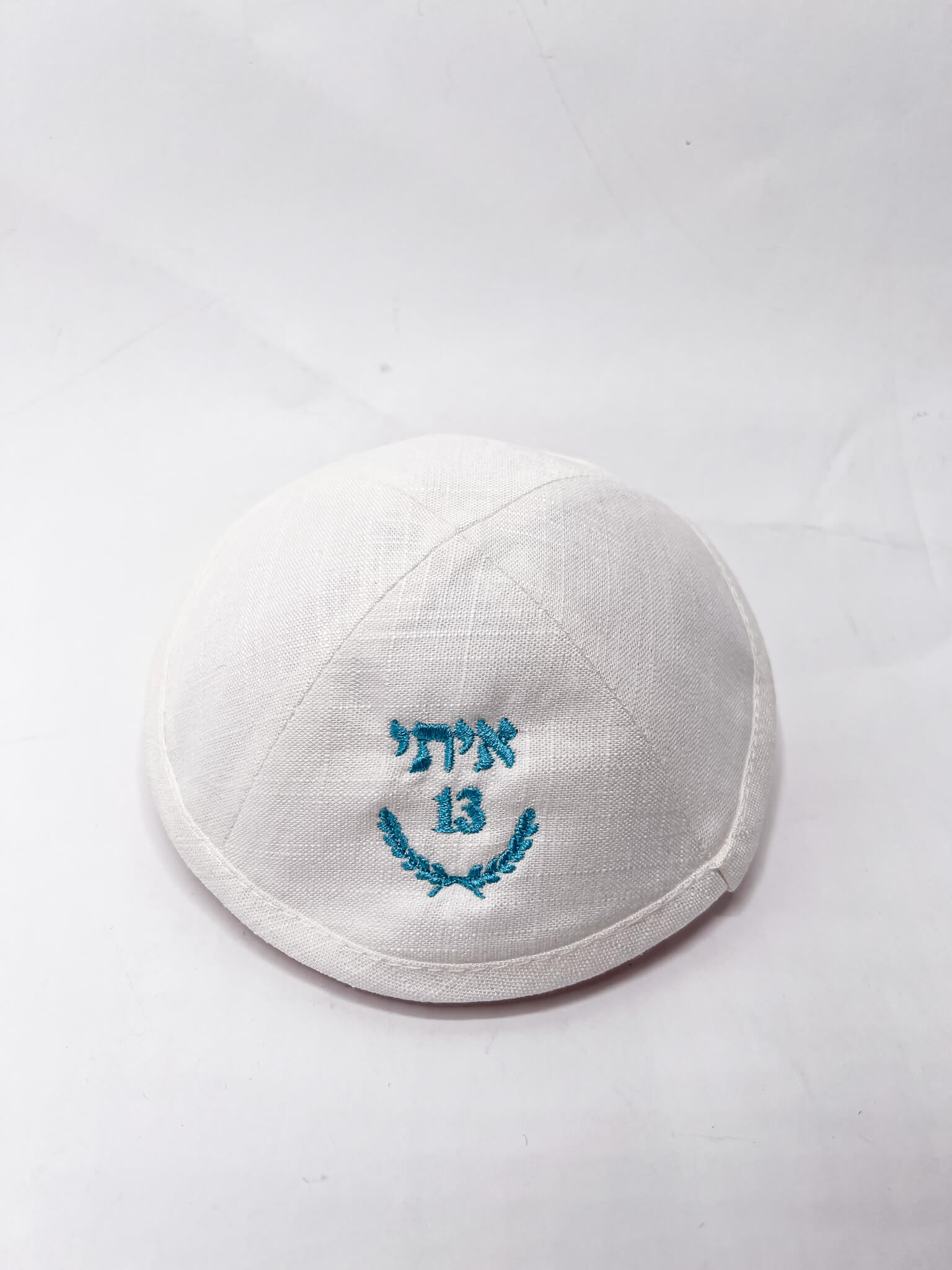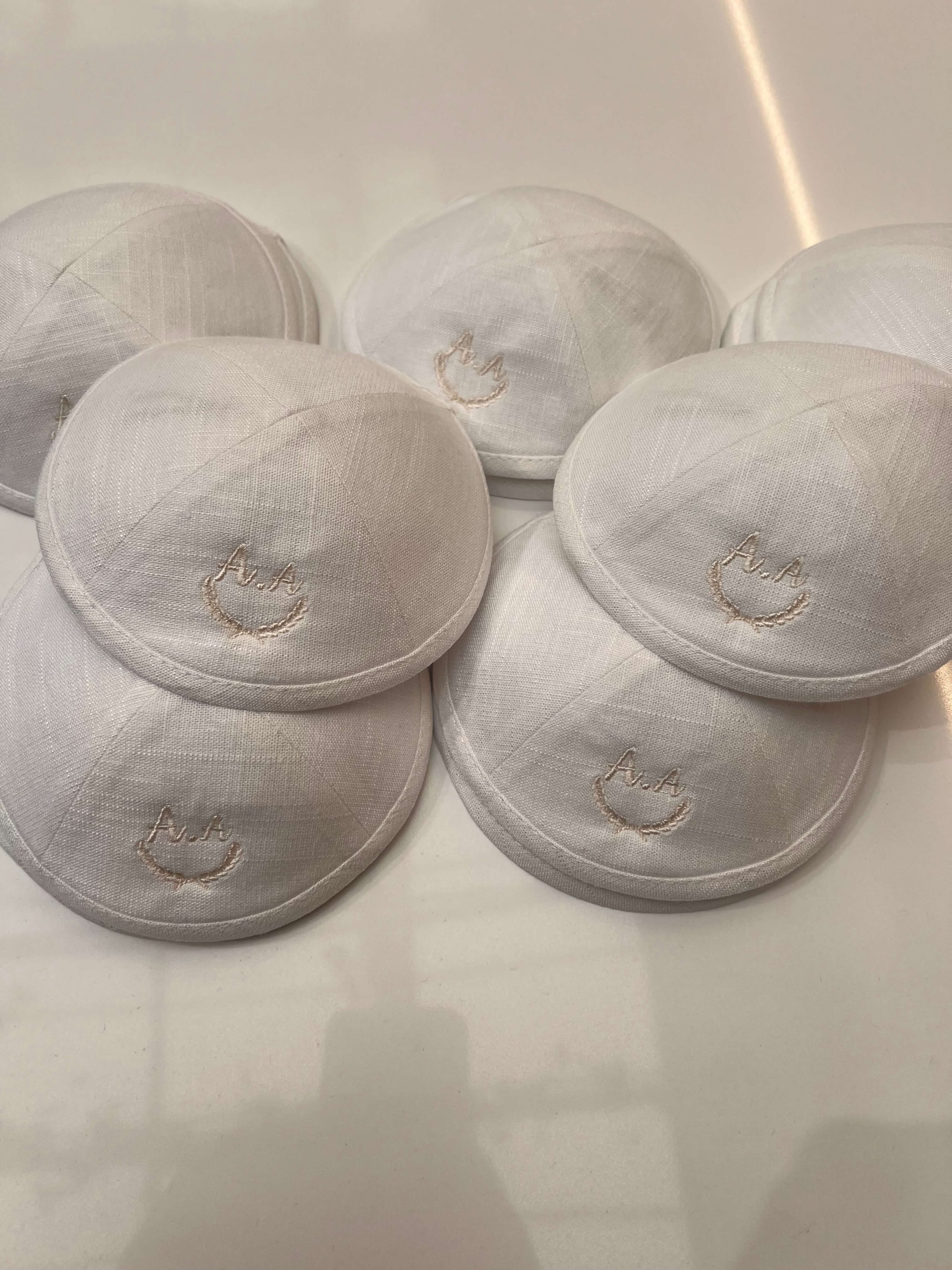 כיפה פשתן יוקרתית לבנה המגיעה עם סיכה בנויה מבפנים של הכיפה. מגיע עם רקמה של עיטור עלים ו2 אותיות ברקמה או שם מלא. קיימים מבחר של צבעים לרקמה לבחירה. קוטר 18 ס"מ