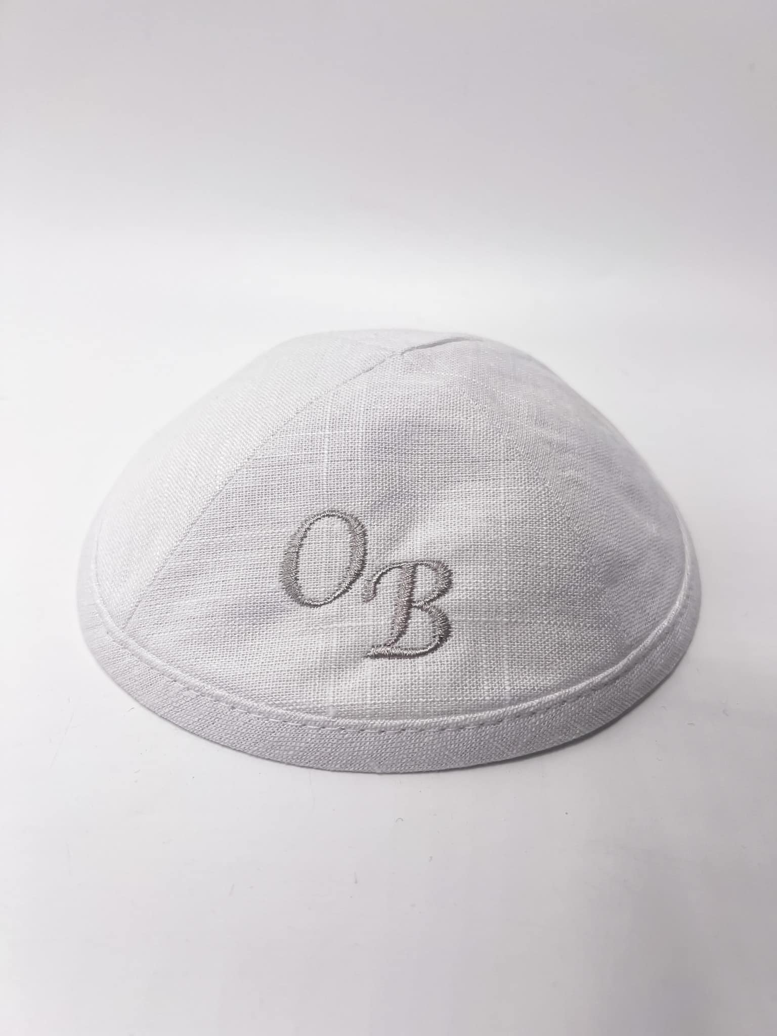 כיפה פשתן לבנה יוקרתית המגיעה עם סיכה המובנית בתוך הכיפה, מגיע עם רקמה של 2 אותיות (אות ראשונה של שם פרטי ואות ראשונה של שם משפחה). קיימים מבחר צבעים של רקמה לבחירה. קוטר 18 ס"מ