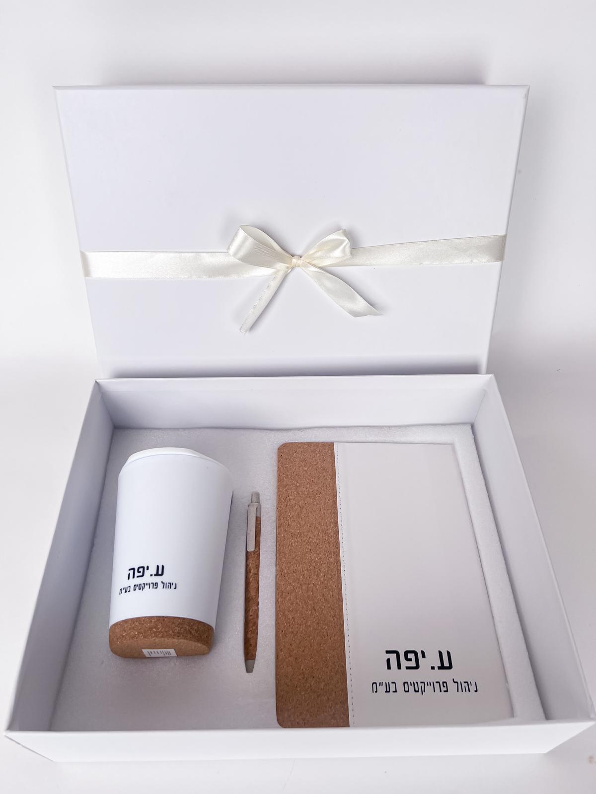 סט מתנה מושלם הכולל מחברת A5 מעוצבת בשילוב שעם ספל תרמי מעוצב בשילוב שעם 330 מ"ל ועט ג'ל בשילוב שעם במארז מתנה הכולל קופסא. על המחברת ועל הספל ישנה הדפסה של לוגו החברה.
