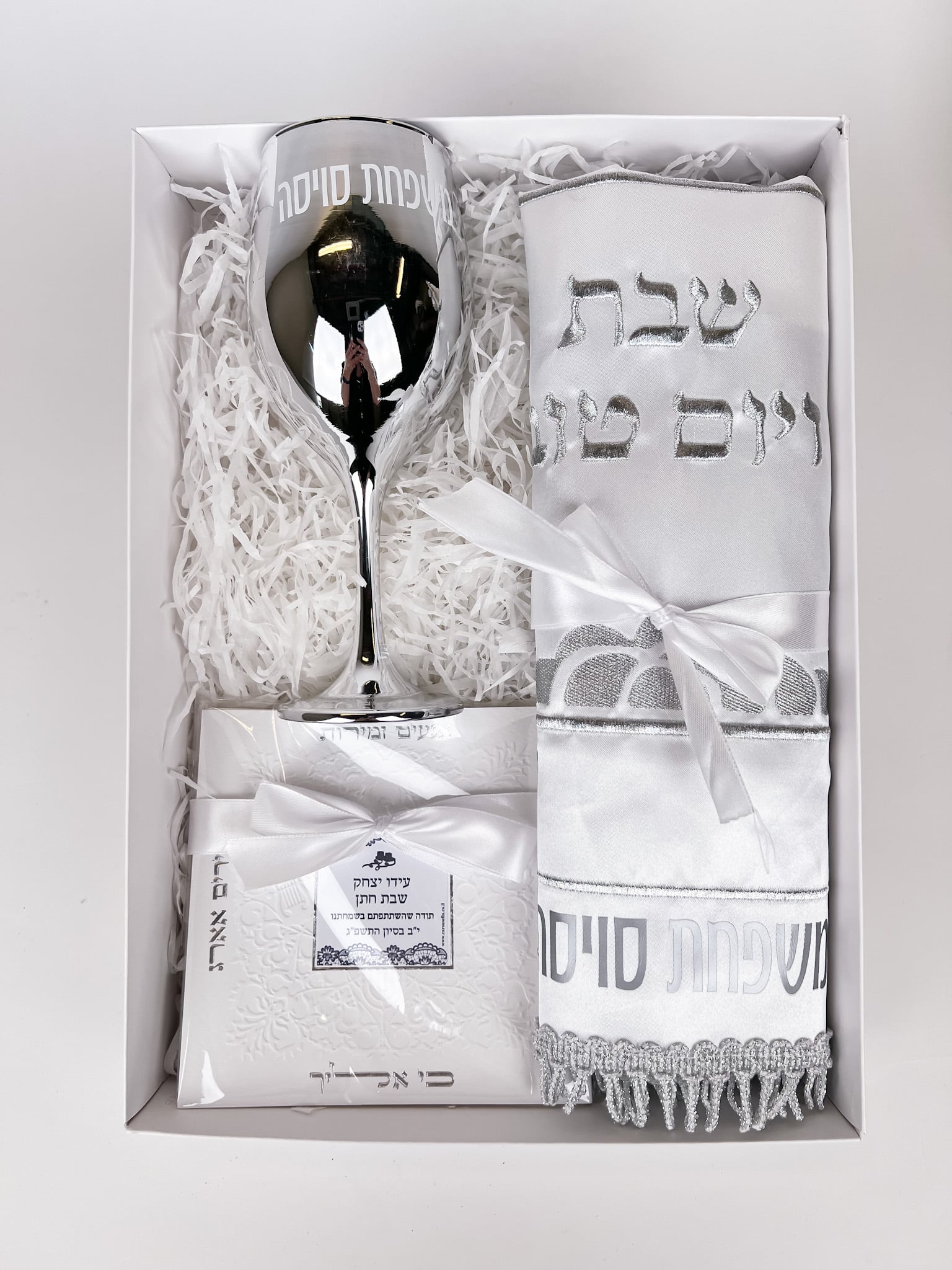 קופסת קרטון לבנה עם חלון שקוף המכילה כיסוי חלה כסוף ועליו רקמת שבת ויום טוב והדפסת שם משפחה בצבע כסף,כוס קידוש מזכוכית עם שם משפחה וברכון זמירות לשבת המכיל 98 עמודים וכולל בתוכו את סדר ברכות לליל שישי/שבת ושירים לשבת. גודל הקופסא 35 ס"מ גובה על 25 ס"מ רוחב על 8 ס"מ בסיס.
