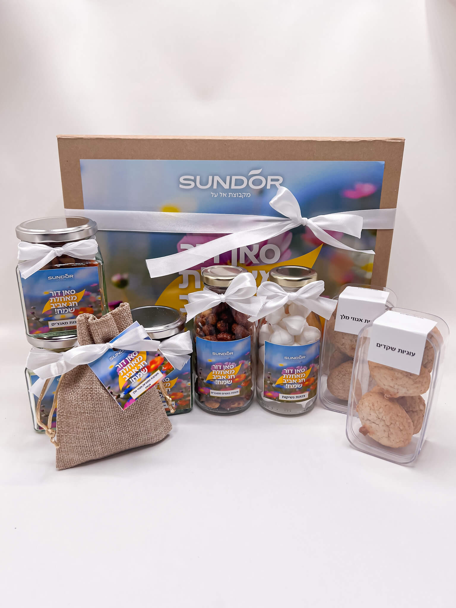 המארז מכיל קופסאת מגנט חומה ממותגת לוגו ובתוכה: צנצנת זכוכית המכילה 250 מ"ל נשיקות מרנג, צנצנת זכוכית המכילה 250 מ"ל בוטנים מסוכרים, צנצנת זכוכית המכילה 282 מ"ל שוקולד שקד חום, צנצנת זכוכית המכילה 282 מ"ל שוקולד שקד לבן, צנצנת זכוכית המכילה 282 מ"ל במילוי מאנצ'יס, שק יוטה במילוי תערובת חמוציות ואגוזי מלך, קריסטלית במילוי עוגיות אגוזי מלך, קריסטלית במילוי עוגיות שקדים. הצנצנות מגיעות ממותגות עם כיתוב ולוגו החברה.