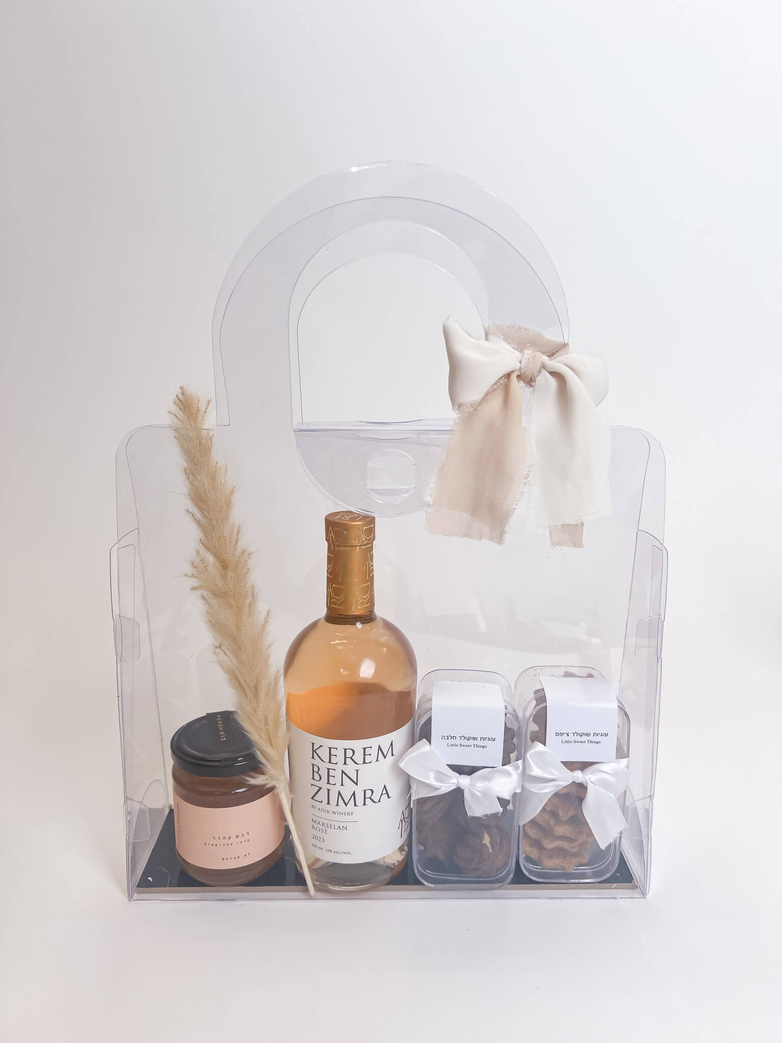 המארז מכיל: קופסא קריסטלית במילוי עוגיות שוקולד צ'יפס ושוקולד בטעם חלבה, יין רוזה המכיל 500 מ"ל של יקב כרם בן זימרה,דבש ממותג המכיל 250 גרם של חברת פרא בשילוב פאמפאס. המארז נארז בתוך תיק שקוף pvc גודל 8.5*21*30.5 ס"מ.