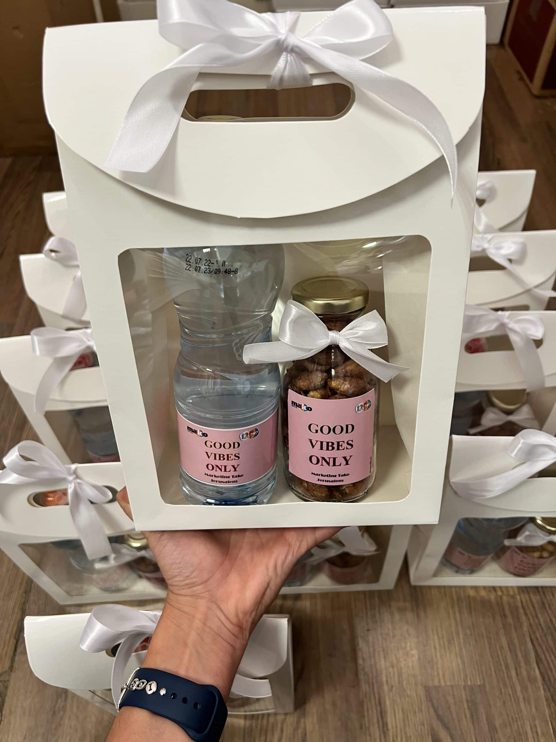 המארז מכיל צנצנת זכוכית המכילה 250 מ"ל של בוטנים מסוכרים ובקבוק מים ממותג. ארוז בתוך קופסת קלפה עם סרט סאטן. ניתן להוסיף הקדשה ולוגו החברה. גודל הקופסא 21 ס"מ גובה על 16 ס"מ רוחב