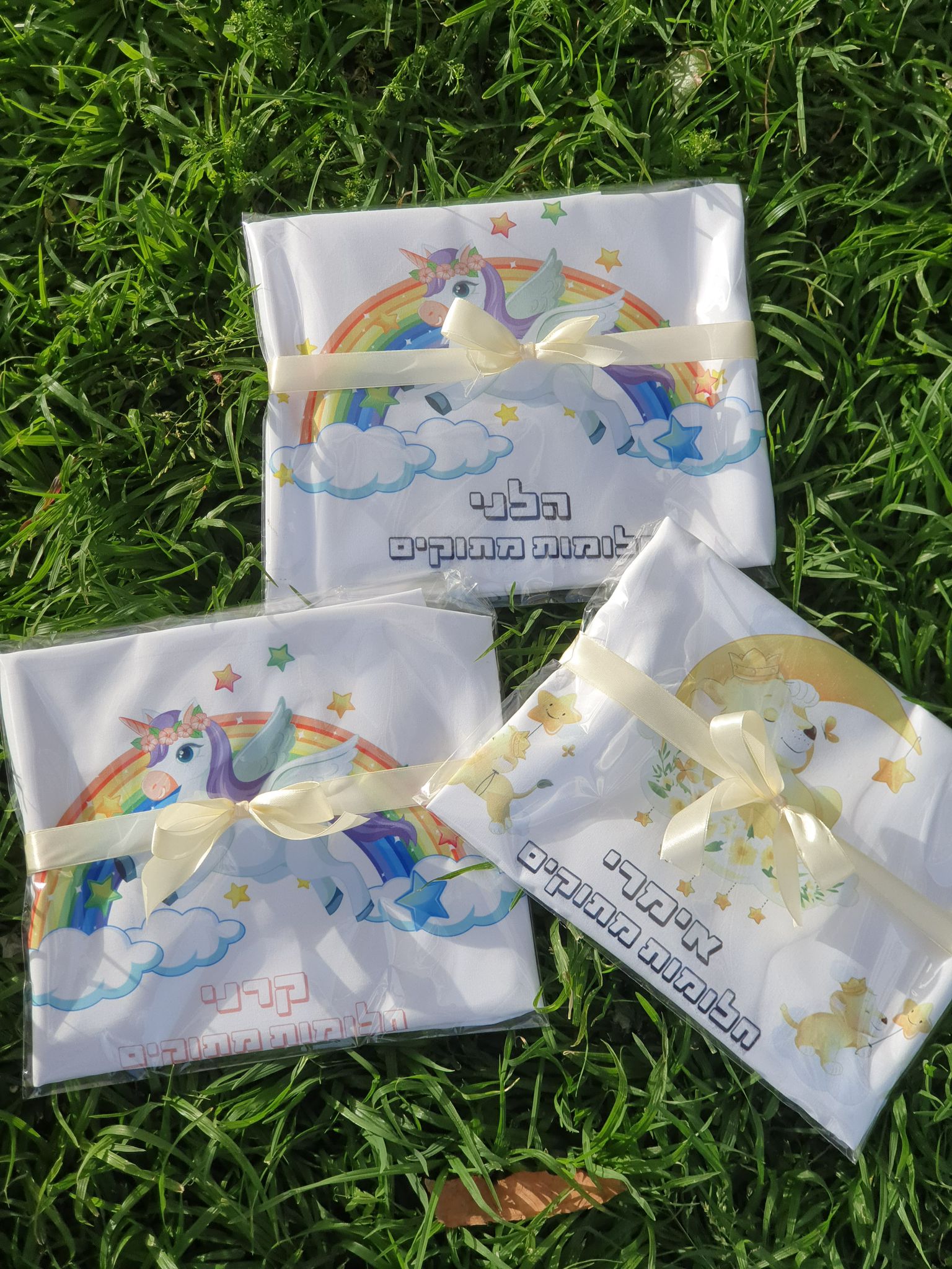 ציפית לכרית בצבע לבן מבד 100% מיקרופייבר עם הדפסת סובלימציה בעיצוב חד קרן קשת בענן ושם הילד/ה. מגיע ארוז עם צלופן וסרט סאטן. גודל הציפית 70 ס"מ רוחב על 50 ס"מ גובה