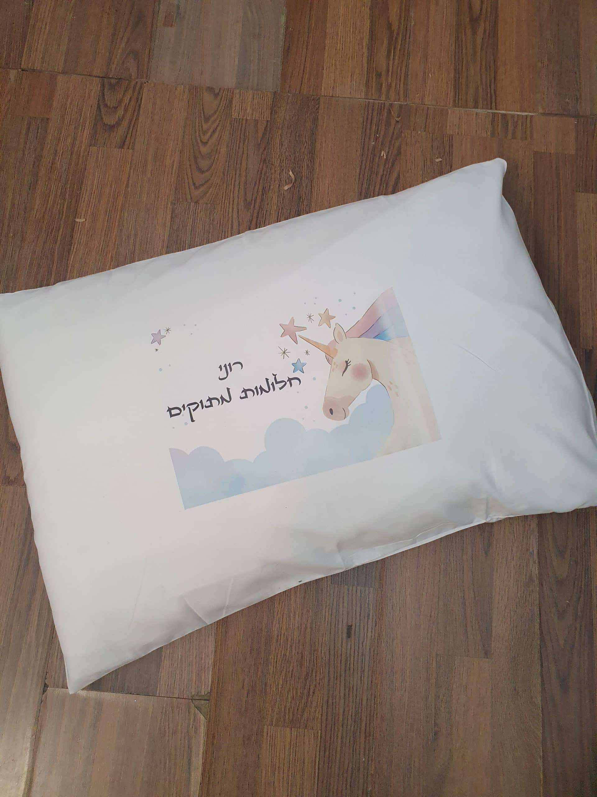 ציפית לכרית בצבע לבן מבד 100% מיקרופייבר עם הדפסת סובלימציה בעיצוב חד קרן  ושם הילד/ה. מגיע ארוז עם צלופן וסרט סאטן. גודל הציפית 70 ס"מ רוחב על 50 ס"מ גובה