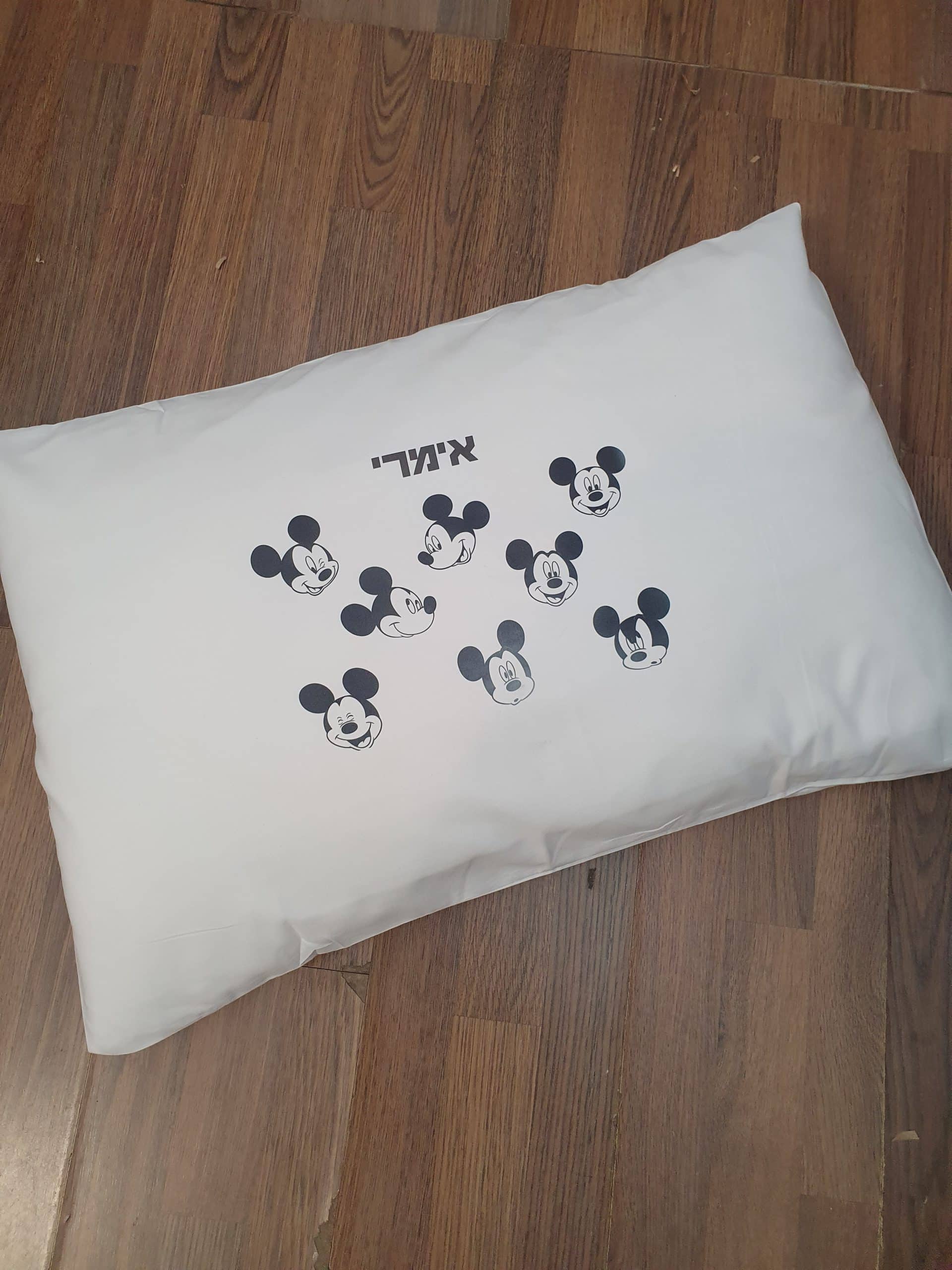 ציפית לכרית בצבע לבן מבד 100% מיקרופייבר עם הדפסת סובלימציה בעיצוב מיקי מאוס שחור לבן ושם הילד/ה. מגיע ארוז עם צלופן וסרט סאטן. גודל הציפית 70 ס"מ רוחב על 50 ס"מ גובה