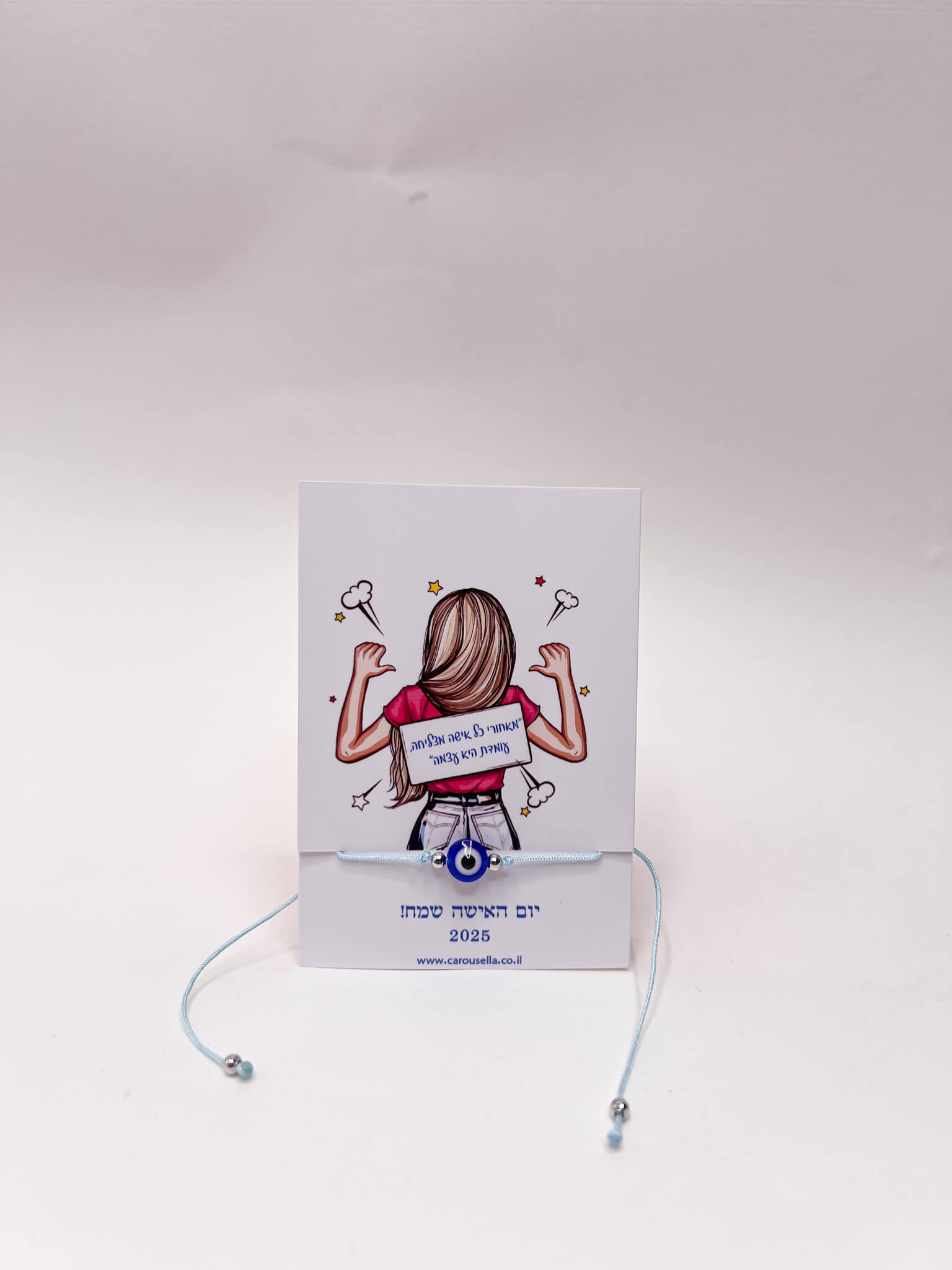 המארז מכיל ברכה ממותגת ליום האישה המודפסת על נייר 260 גרם, בשילוב צמיד עין כחולה. מגיע ארוז עם שקית אורגנזה וסרט סאטן.