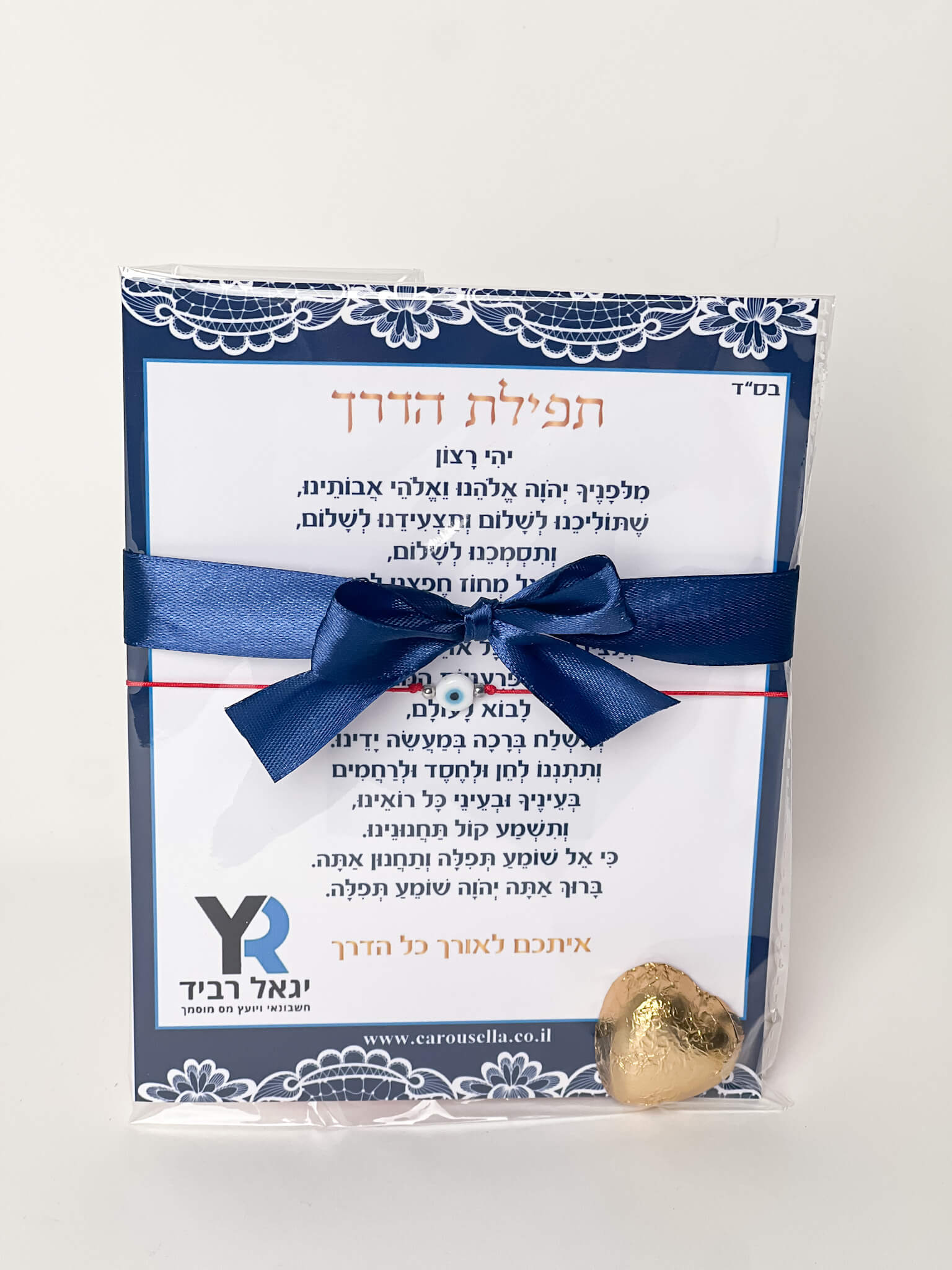 ברכה תפילת הדרך מודפסת על נייר מעוצב 260 גרם עם קוביית מגנט מאחור, גודל הברכה 18*13.5 ס"מ , מגיעה עם צמיד עין כחולה וחוט אדום ואריזת צלופן ושוקולד לב זהב. המארז נארז עם סרט סאטן מעל.