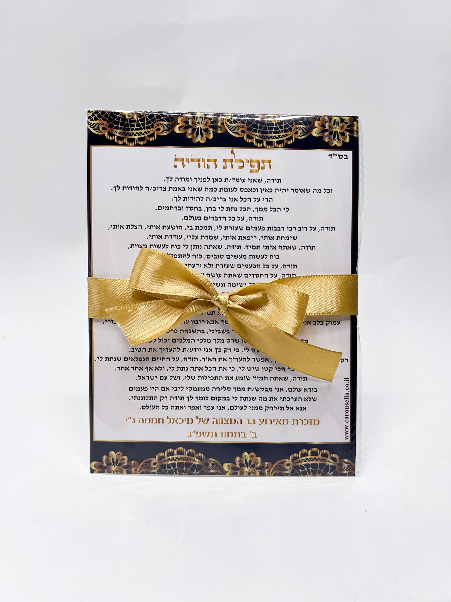 הברכה מודפסת על נייר 260 גרם עם קוביית מגנט בגב. האריזה ארוזה עם צלופן וסרט סאטן.